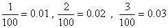 The denominator 100 has 2 zeros. When dividing 1 by 100, we move the decimal point in “1.” to the left by 2 places over 1 and add 0 where necessary to get to 0.01.
