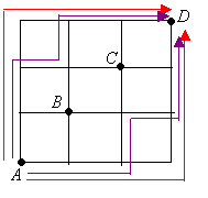 A path from point A to point D is determined by moving upward or to the right along the grid lines