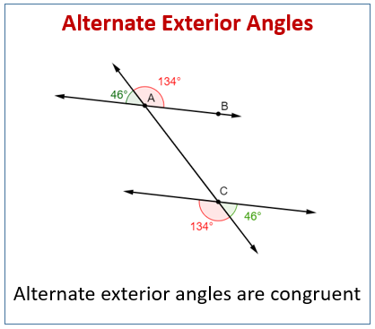 Alternate exterior angles are formed by a transversal intersecting two parallel lines . They are located “outside” the two parallel lines but on opposite sides of the transversal, creating two pairs (four total angles) of alternate exterior angles. Alternate exterior angles are congruent, meaning they have equal measure.