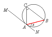 In the following diagram, MN is a tangent to the circle at the point of contact A. Identify the angle that is equal to x