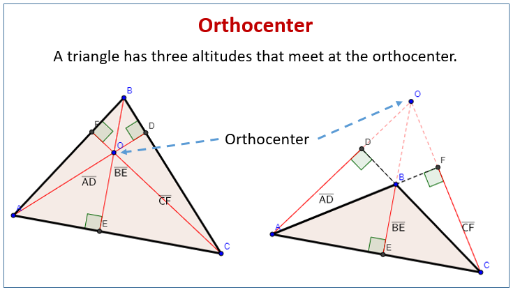 The following diagrams show the orthocenter of an acute triangle and an obtuse triangle. Scroll down the page for more examples and solutions.