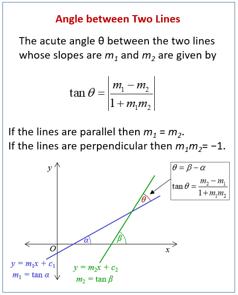 The following diagram gives the formula to find the angle between two lines. Scroll down the page for more examples and solutions.