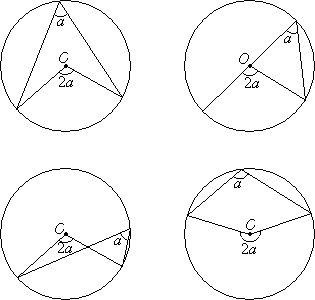 The following diagrams show the central angle of a circle is twice any inscribed angle subtended by the same arc.