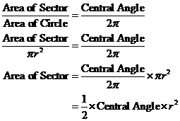 Comparing the area of sector and area of circle, we get the formula for the area of sector when the central angle is given in radians.