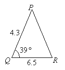 Find the area of triangle PQR if p = 6.5 cm, r = 4.3 cm and Q = 39˚. Give your answer