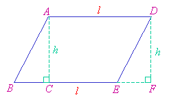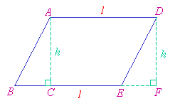 You may notice that lh is also the area of a rectangle with dimensions l and h. The diagram below will explain why. If we cut out the triangle ABC and add it to the other side (triangle DEF), you will have a rectangle with dimensions l and h that has the same area as the original parallelogram.
