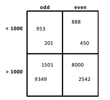 The following diagram shows an example of a Carroll Diagram. Scroll down the page for more examples and solutions on how to use Carroll Diagrams.
