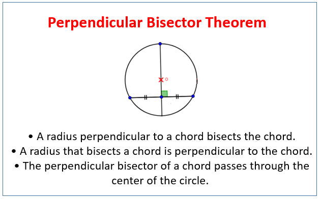 The following diagram gives the perpendicular bisector theorem for the chords in a circle. Scroll down the page for more examples and solutions.