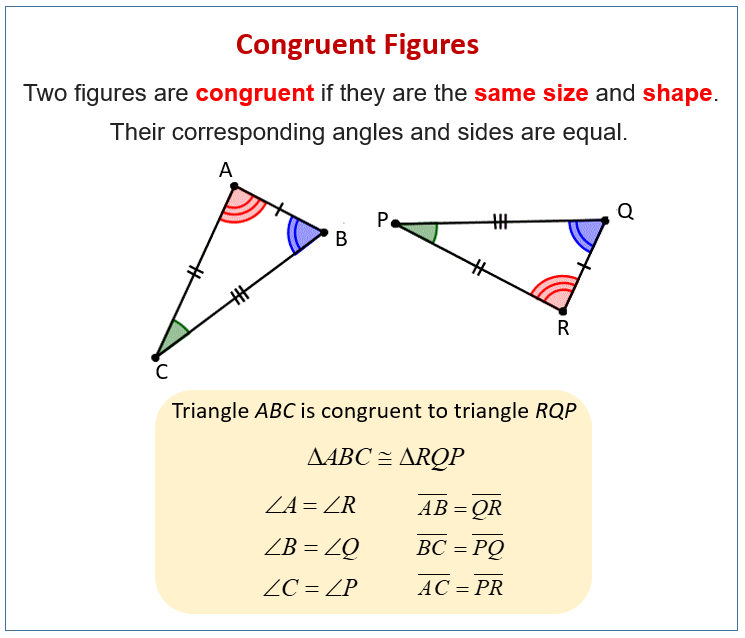 The following diagram gives the definition and explanation for congruent figures. Scroll down the page for more examples and solutions.