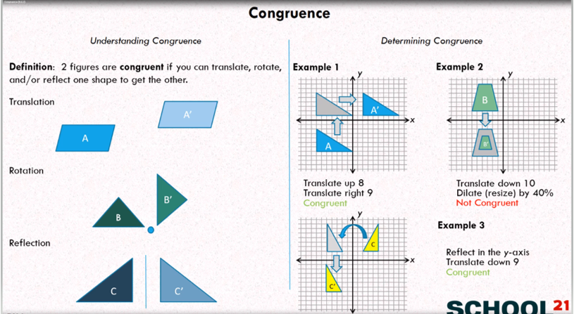 Congruence and Transformations Using congruence transformations, including translation, reflection, and rotation.