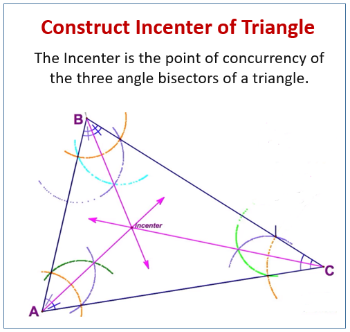 The following diagram shows how to construct the incenter of a triangle. Scroll down the page for more examples and solutions.