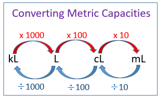 The following diagram shows the conversion chart for metric units of capacities: kiloliters, liters, centiliters and milliliters. Scroll down the page for more examples and solutions.