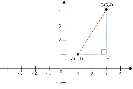 For example: To find the distance between A(1,1) and B(3,4), we form a right angled triangle with A̅B̅ as the hypotenuse. The length of A̅C̅ = 3 – 1 = 2. The length of B̅C̅ = 4 – 1 = 3.