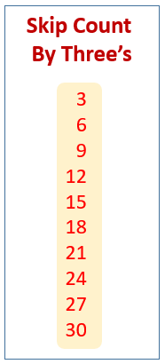 The following skip count charts show how to skip count by 3’s. Practice reading the numbers in red to skip count by 3. Scroll down the page for more examples, worksheets, and songs.