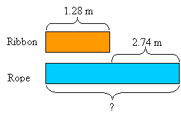 The length of a ribbon is 1.28 m. The length of a rope is 2.74 m longer than the ribbon.
