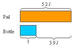 A pail holds 5.2 l of water. A bottle holds 3.9 l less water than the pail. What is the volume of water in the bottle?