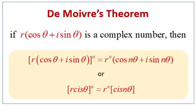 The following diagram shows the De Moivre’s Theorem for complex numbers. Scroll down the page for more examples and solutions.