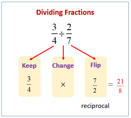 The following diagram gives an example of dividing fractions using reciprocal. Scroll down the page for more examples and solutions.