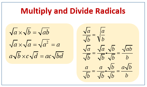 The following diagram shows some of the rules for multiplying, dividing, and simplifying radicals. Scroll down the page for more examples and solutions.