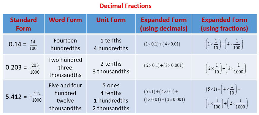 The following diagram shows how to name decimal fractions in standard, word, unit, and expanded forms by applying place value reasoning. Scroll down the page for more examples and solutions.