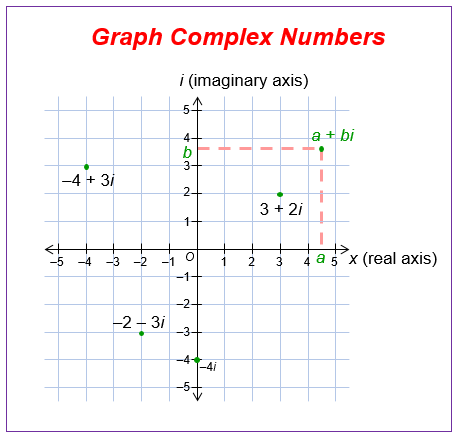 The following diagram shows how to graph complex numbers on the complex plane. Scroll down the page for more examples and solutions on how to graph complex numbers.
