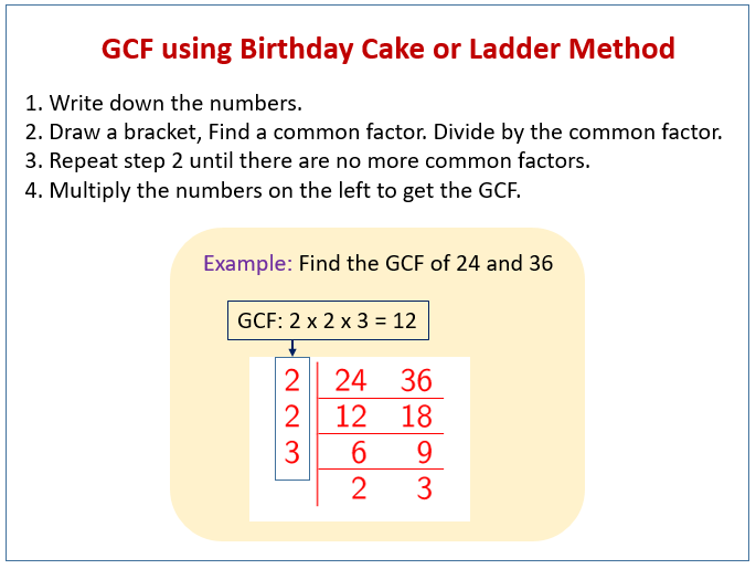 The following diagram shows an example of finding the greatest common factor using birthday cake or ladder method. Scroll down the page for more examples and solutions on the greatest common factor (GCF).