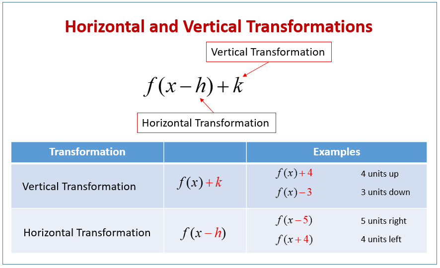 The following diagrams show horizontal and vertical transformations of functions and graphs. Scroll down the page for more examples and solutions on horizontal and vertical transformations.