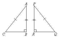In the following right triangles ΔABC and ΔPQR , if AB = PR, AC = QR then ΔABC ≡ ΔRPQ .