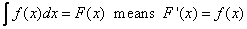 \( \int f(x) dx = F(x) + C \) means that \( F’(x) = f(x) \)