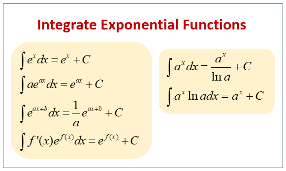 The following diagrams show the integrals of exponential functions. Scroll down the page for more examples and solutions on how to integrate exponential and natural log functions.