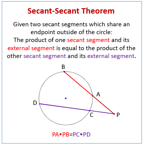 The following diagram shows the Secant-Secant Theorem. Scroll down the page for more examples and solutions on how to use the Secant-Secant Theorem.
