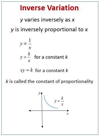 The following diagram shows the key concepts of inverse variation. Scroll down the page for more examples and solutions on Inverse Variation Word Problems.