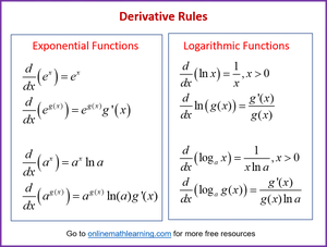 Fun game to to test your knowledge of differential calculus. This Derivative (Exp, Log) Quiz and Game is a great way to practice and put your skills to the test in a fun environment. Find the derivative of a Exp, Log. It includes the fundamental rules of differentiation (Power, Product, Quotient, and Quotient rules) as well as common derivatives (Trig, Exponential, Logarithmic)
