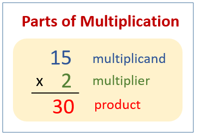 The following diagram shows the parts of a multiplication: multiplicand, multiplier and product. Scroll down the page for more examples and solutions on multiplication.