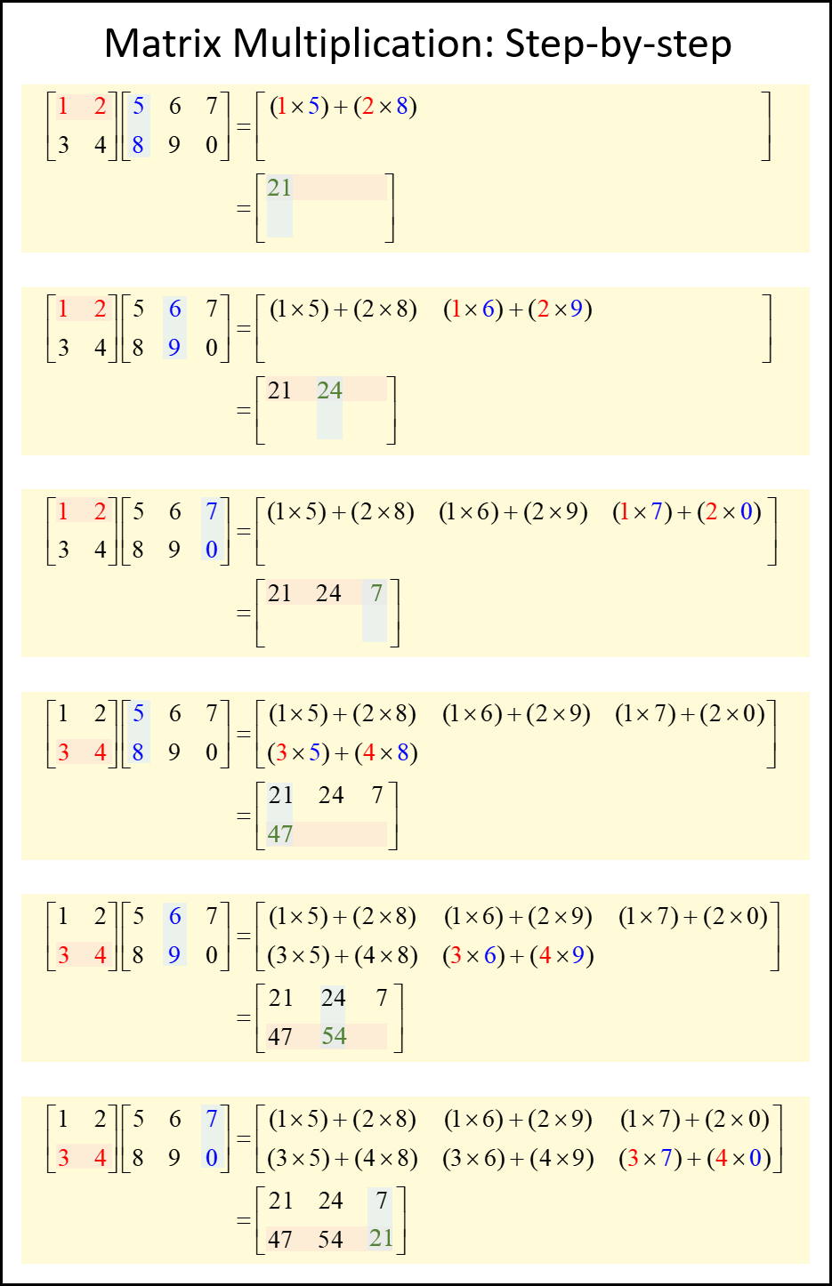 The following diagram shows how to multiply two matrices. Scroll down the page for more examples of multiplying matrices and other matrix operations.
