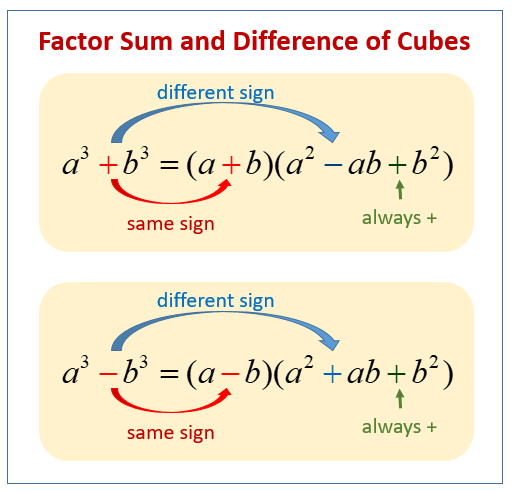 The following diagram shows how to factor the sum and difference of cubes. Scroll down the page for more examples and solutions on factoring polynomials.