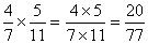 \(\frac{4}{7}\times \frac{5}{11}=\frac{4\times 5}{7\times 11}=\frac{20}{77}\)
