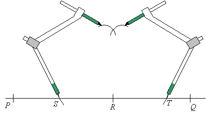 Step 1: Stretch your compasses a short length. It can be any length. Put the sharp end of the compasses on point R and mark two arcs S and T on the line PQ.