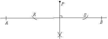 Step 1: Put the sharp end of your compasses on point P, stretch the compasses and mark two arcs R and S on the line AB.