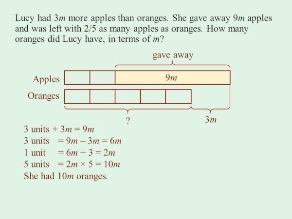 Lucy had 3m more apples than oranges. She gave away 9m apples and was left with 2/5 as many apples as