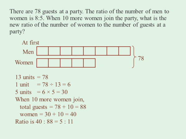 There are 78 guests at a party. The ratio of the number of men to women is 8:5. When 10 more women