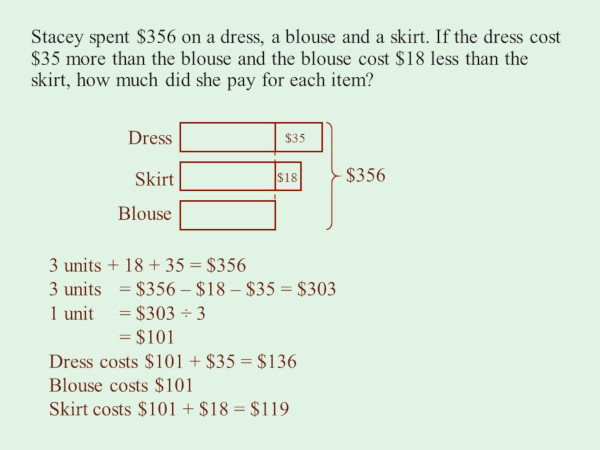 Stacey spent $356 on a dress, a blouse and a skirt. If the dress cost $35 more than the blouse and the