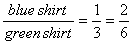 First, you need to make the common item (in this case blue shirts) the same for both ratios. Convert the ratio of blue shirts to green shirts to its equivalent: