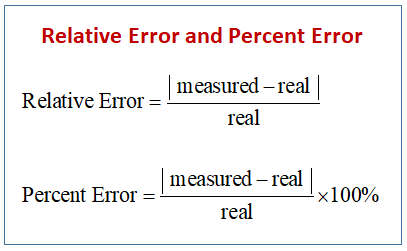 The following diagram shows the formula for relative error and percent error. Scroll down the page for more examples and solutions on using the relative error and percent error formula.
