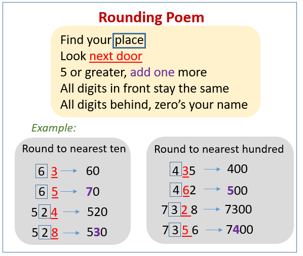 The following diagram shows how to round numbers using the rounding poem. Scroll down the page for more examples and solutions.