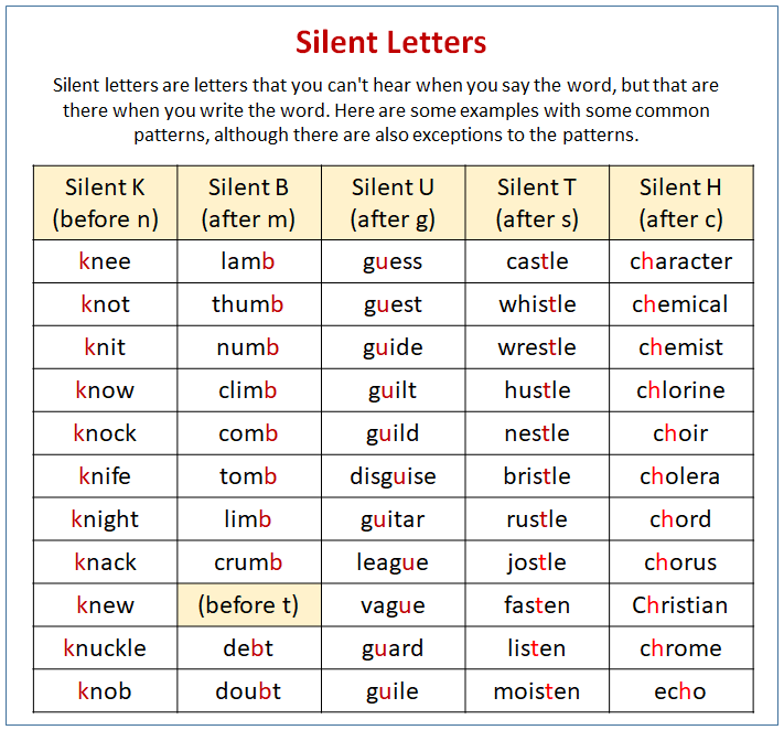 The following diagram shows a list of silent letter words for the silent letters: k, b, u, t, h. Scroll down the page for more examples and explanations when saying words with silent letters.