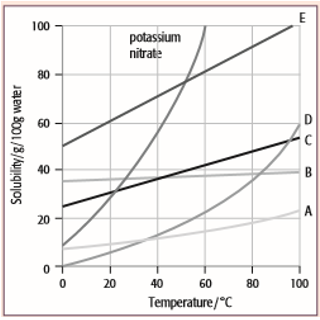 The solubility curves for potassium nitrate and five solids, A, B, C, D and E, are shown for the temperature range 0°C to 100°C. The solubility is given in grams of the solid that will dissolve in 100 grams of water.
