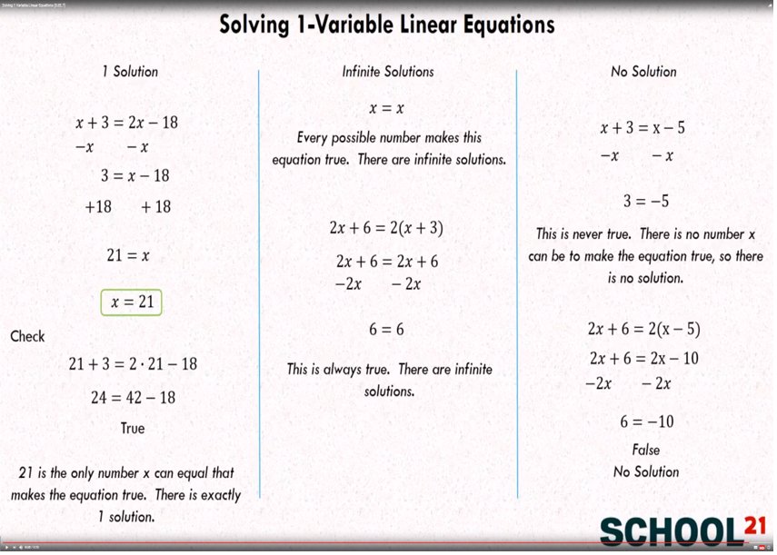 How to determine if an equation has one solution (which is when one variable equals one number), or if it has no solution (the two sides of the equation are not equal to each other) or infinite solutions (the two sides of the equation are identical)?