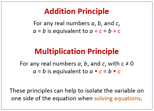 The following diagram shows the addition principle and multiplication principle. Scroll down the page for more examples and solutions in using the addition principle and multiplication principle to solve equations.