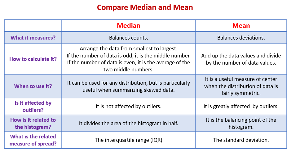 The following table compares median and mean. Scroll down the page for more examples and solutions.